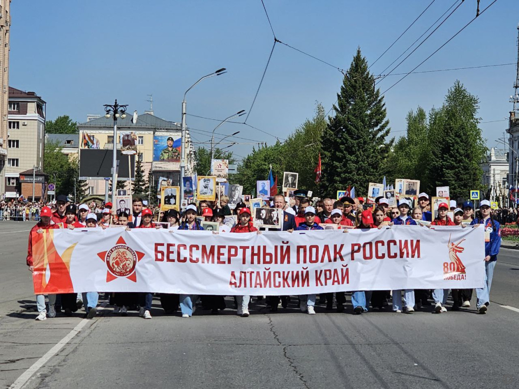 Шествие «Бессмертного полка» началось от площади Советов, где перед этим состоялось торжественное построение войск Барнаульского гарнизона. Впереди колонны пронесли знамя Победы из 6210 лоскутов с вышитыми именами героев.