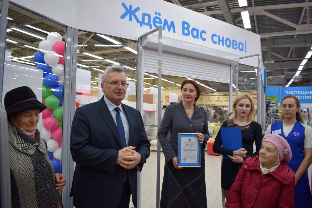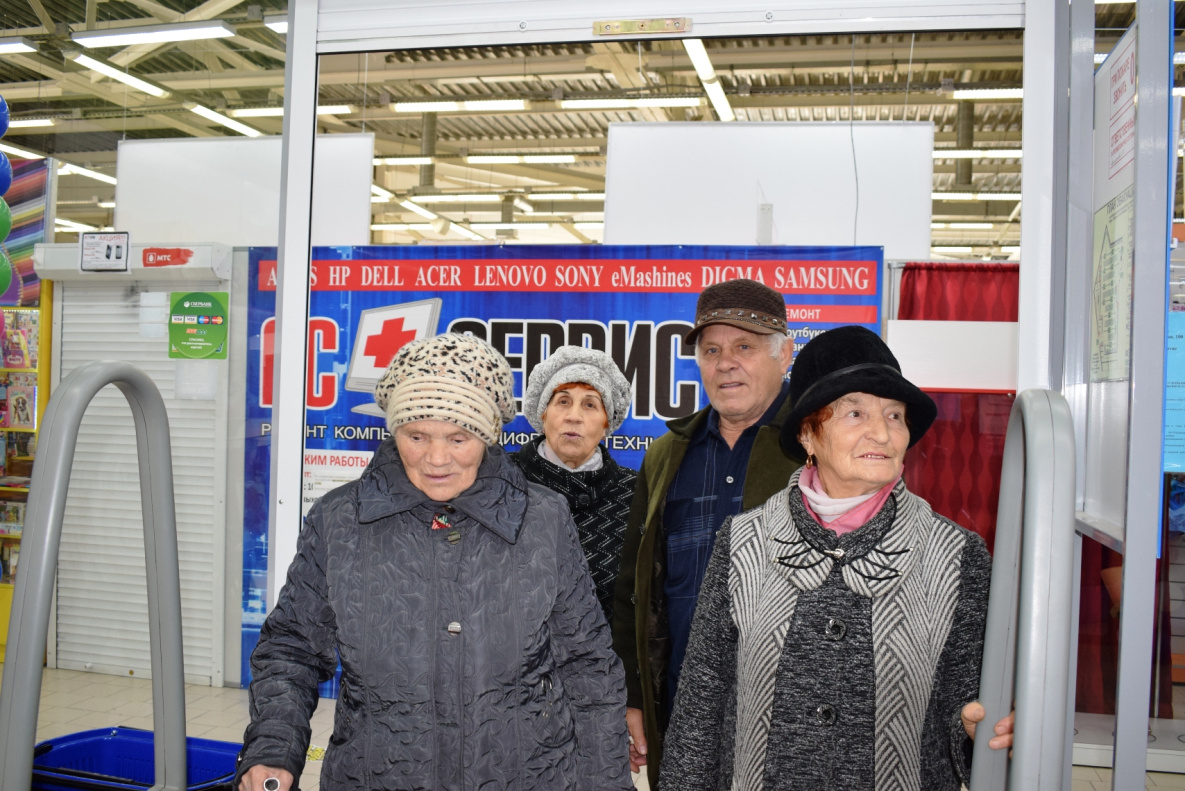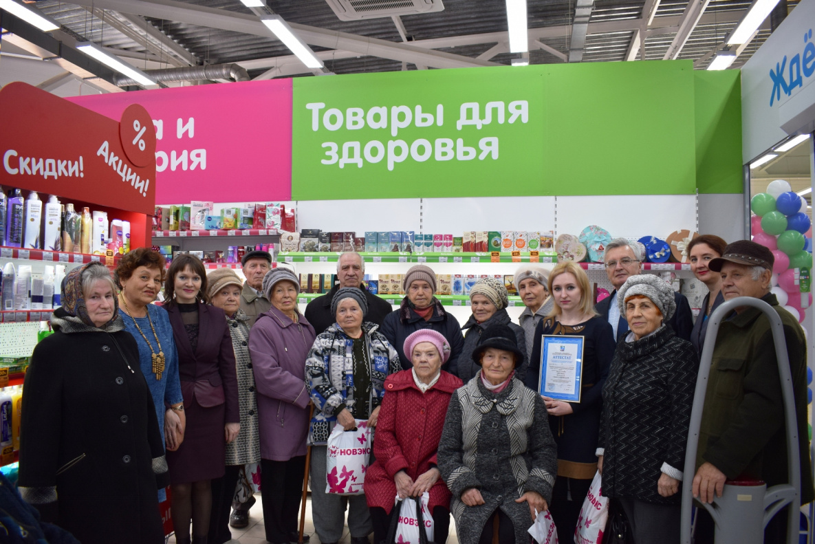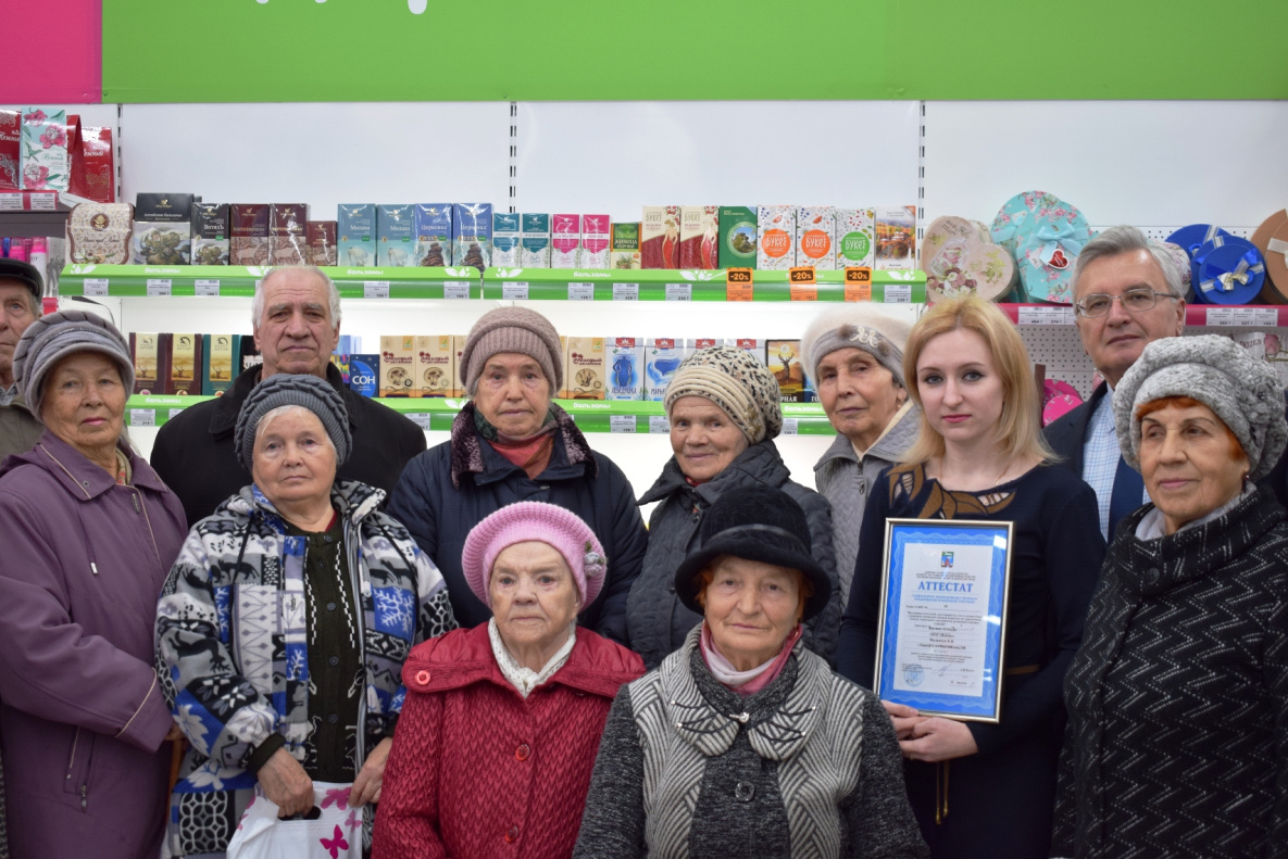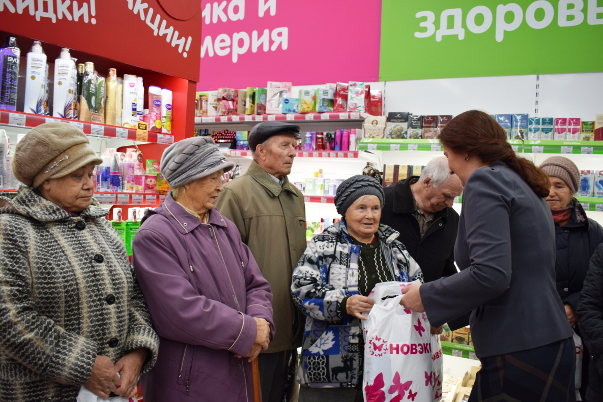 Первым покупателям – активу ветеранского движения Индустриального района, среди которых ветераны и дети войны, вручили дисконтные карты и подарки.