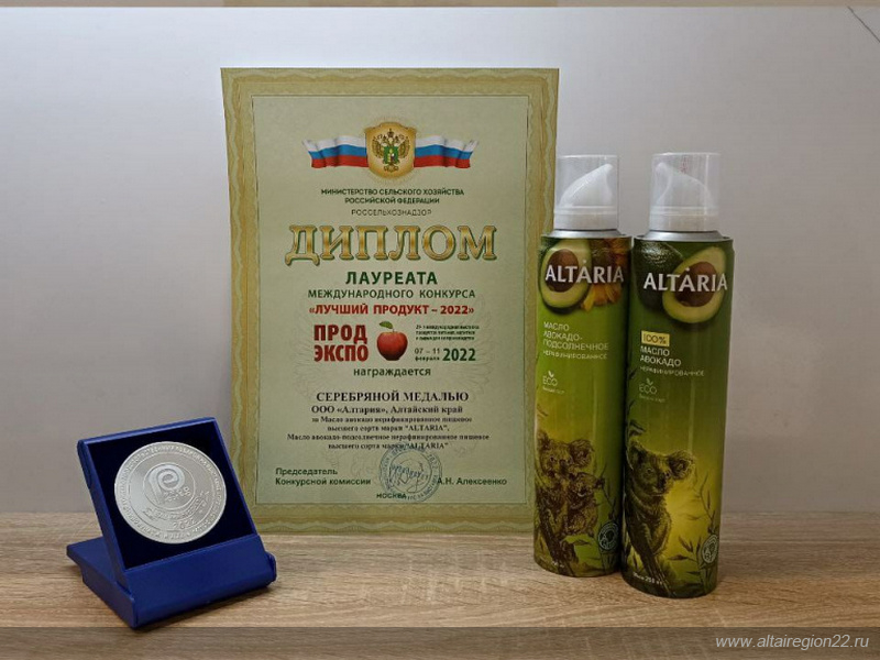 Растительные масла в спрее бренда Altaria (масла авокадо и авокадо-подсолнечное) стали лауреатами Международного конкурса «Лучший продукт - 2022» и награждены дипломом и серебряной медалью. «Большинству посетителей выставки не нужно было объяснять, что в такой необычной вакуумной упаковке хранится пищевое растительное масло. А значит, ниша, которую Altaria развивает почти четыре года в России наконец сформирована», - говорит о своем продукте создатель бренда Яна Попова. В ходе выставки компанией достигнуты договоренности об экспортных поставках в Арабские Эмираты, Израиль, США, Монголию, Китай.