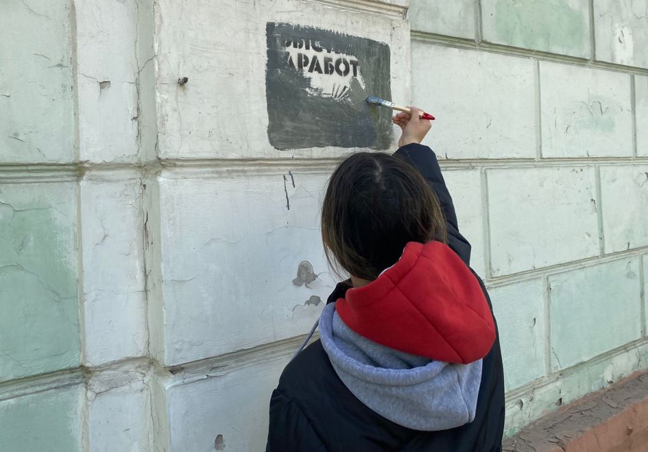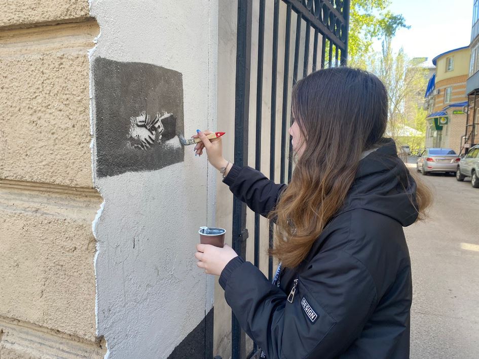 Студенты Международного колледжа сыроделия и профессиональных технологий закрасили 17 надписей на фасадах домов и зданий по проспектам Комсомольскому и Ленина (от ул. Молодежной до ул. Советской), ул. Союза Республик (от пр-кта Ленина до пр-кта Комсомольского) и ул. Советской (от пр-кта Ленина до пр-кта Комсомольского).