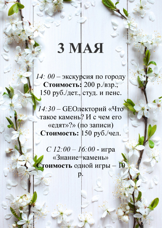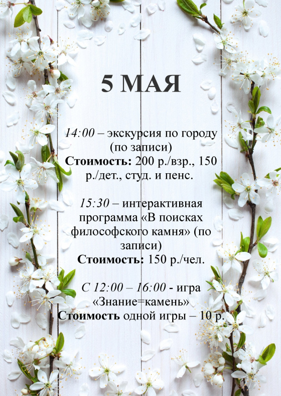 В праздничные выходные с 1 по 5 мая в музее «Мир камня» (ул.Ползунова, 39) для гостей запланированы познавательные программы (на фото). Все пять дней во второй половине дня желающим предложат интересные экскурсии как по музею, так и по городу.