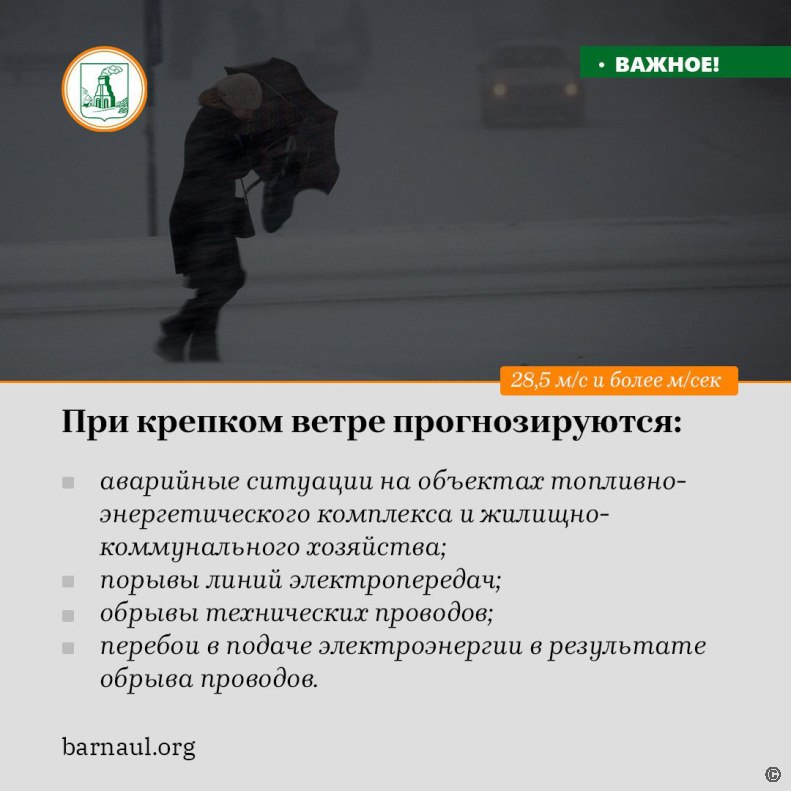 БезопасностьНапомним, по прогнозу синоптиков, 4 и 5 апреля в Алтайском крае ожидается усиление ветра до 18-23 м/с, местами с порывами до 25-30 м/с. В Барнауле 4 апреля переменная облачность, также преимущественно без осадков. Ветер южный ночью 5-10 м/с, днём 10-15 м/с.