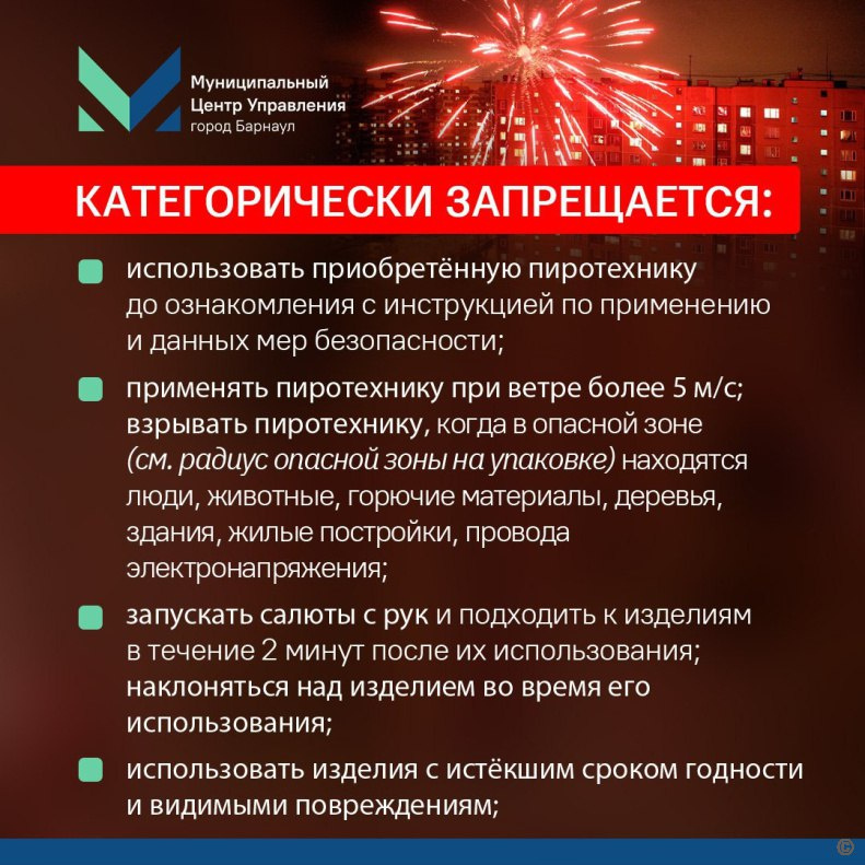 - категорически запрещается запускать пиротехнические средства в городе рядом с жилыми домами, они могут попасть в окно или форточку, залететь на балкон или чердак. Также нельзя использовать пиротехнику в закрытых помещениях, квартирах, офисах, в местах с массовым пребыванием людей.