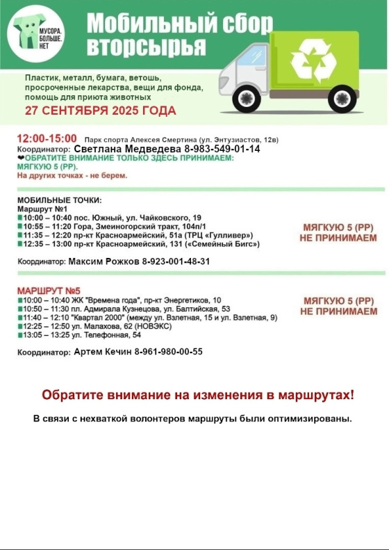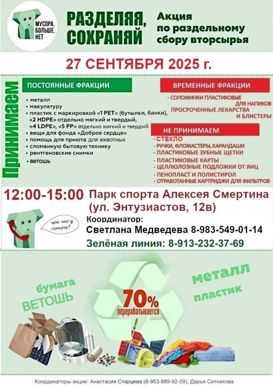 В субботу, 27 сентября, в Барнауле состоится экологическая акция по раздельному сбору отходов «Разделяя сохраняй!». Организаторами мероприятия выступает общественная организация «Мусора.Больше.Нет» при поддержке комитета по благоустройству города Барнаула.
