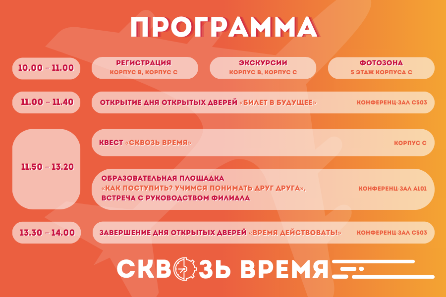 Гости Академии получат информацию от специалистов приёмной комиссии, встретятся с руководством филиала и зададут все интересующие вопросы, познакомятся с преподавателями и студентами, совершат экскурсии по кампусу.