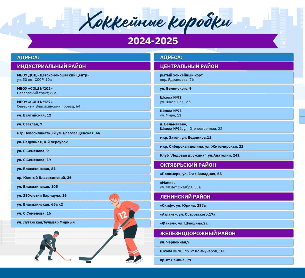 32 хоккейные коробки смогут посетить барнаульцы со своими коньками. На коробках нет проката коньков, но они доступны для любителей бесплатно, без выходных и без ограничений по времени. Адреса хоккейных коробок по ссылке.