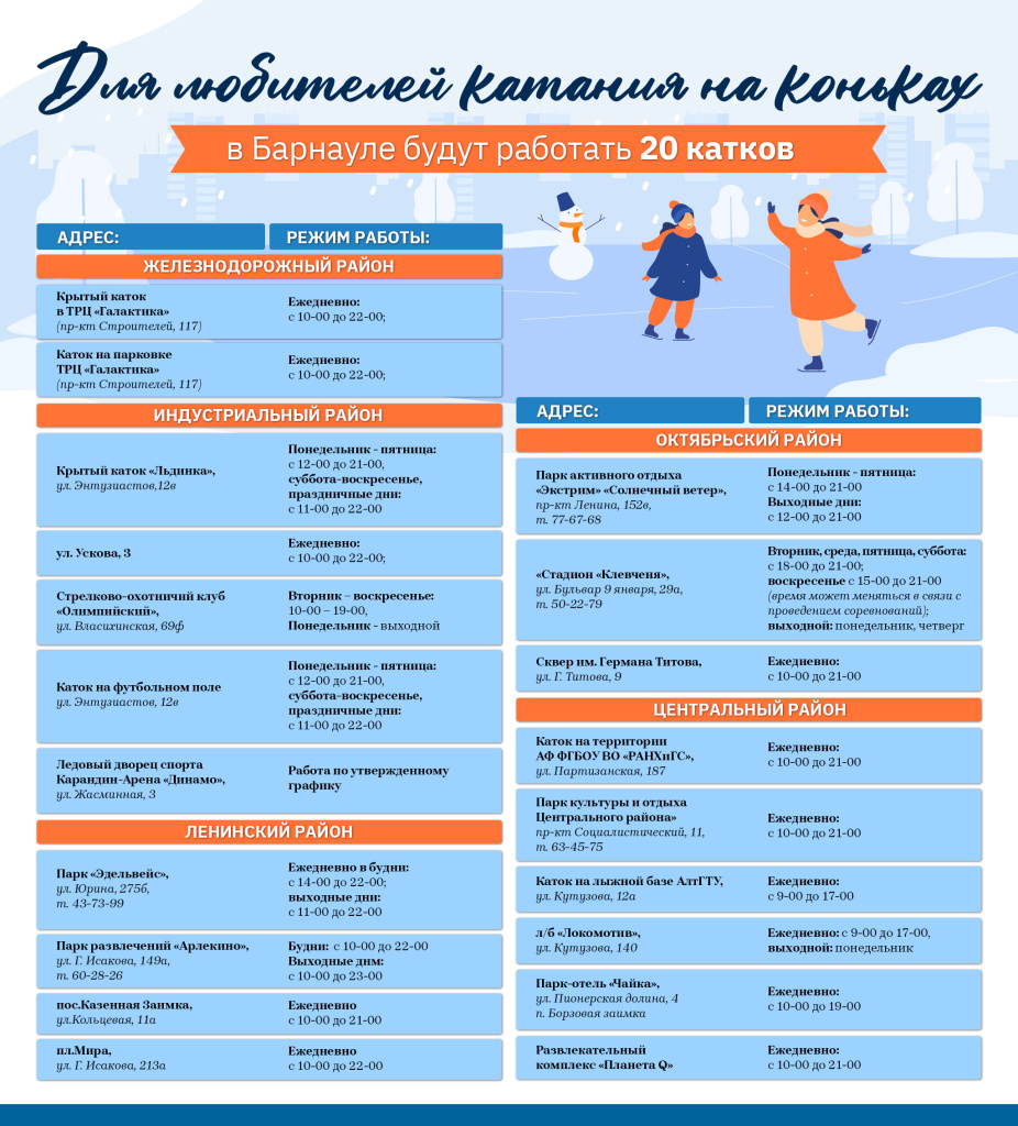 Для любителей активного отдыха в Барнауле работает 21 каток, 32 хоккейные коробки и 18 лыжных баз