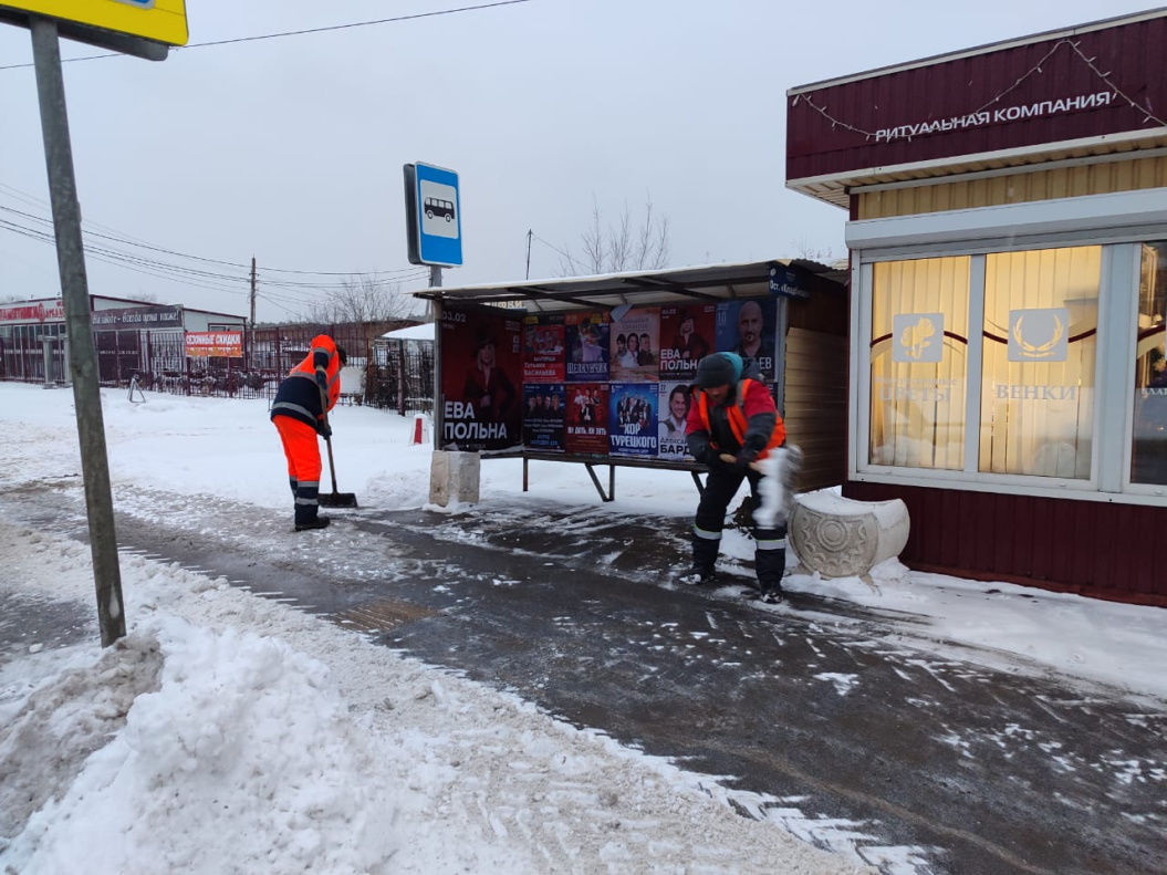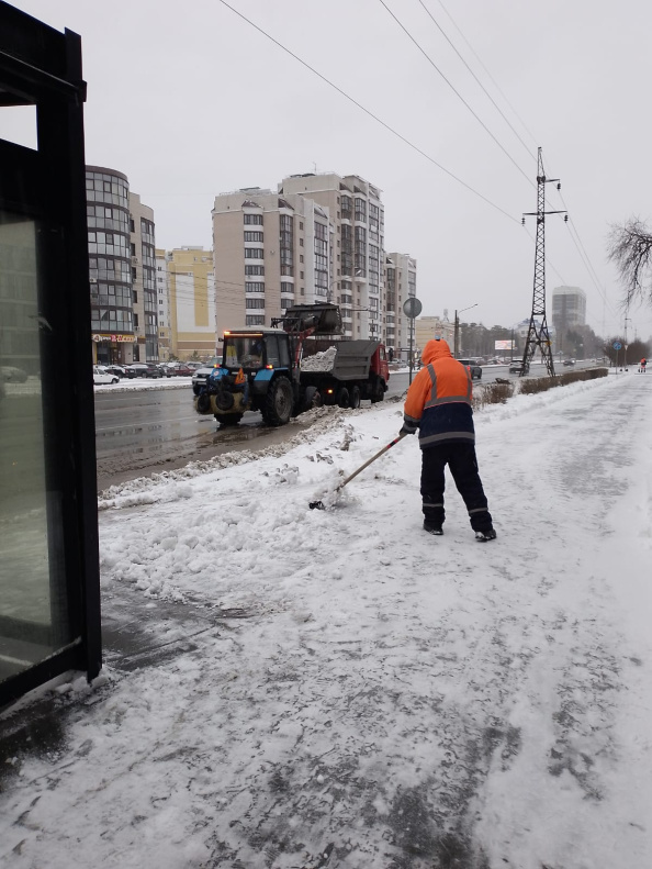 В дневную смену дорожные бригады продолжают вывоз снежных куч после очистки остановочных павильонов и подходов к пешеходным переходам во всех районах города.