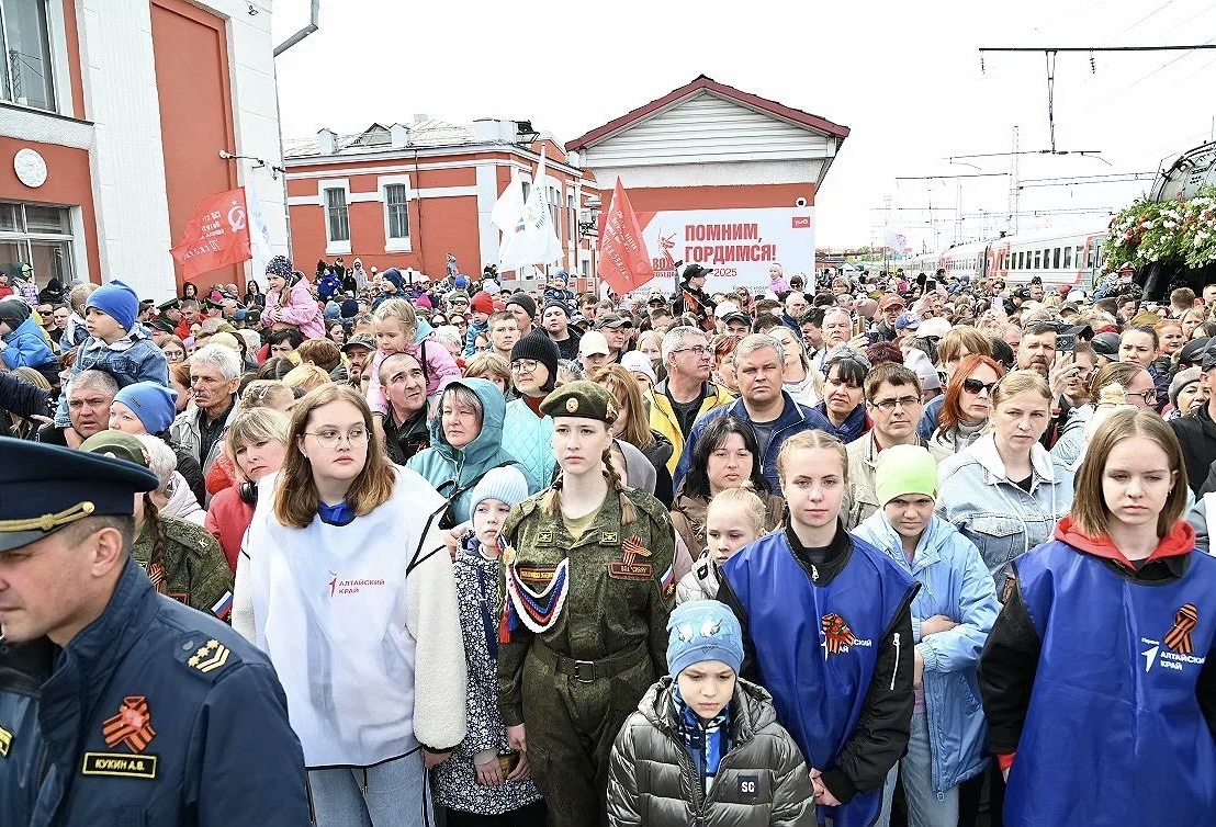 К 10.30 перрон вокзала был заполнен полностью, как и пешеходный мост через железнодорожные пути, люди там стояли даже на ступеньках. До прибытия эшелона Победы горожане успели посмотреть мини-представление Государственного молодежного ансамбля песни и танца «Алтай», многие подпевали знакомым с детства песням. Среди тысяч барнаульцев, пришедших встретить легендарный паровоз, больше половины составляли дети и подростки.