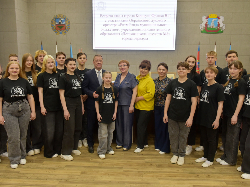 Сегодня, 16 мая, глава города Барнаула Вячеслав Франк встретился с участниками Образцового духового оркестра «Ритм Бэнд» муниципального бюджетного учреждения дополнительного образования «Детская школа искусств №8».