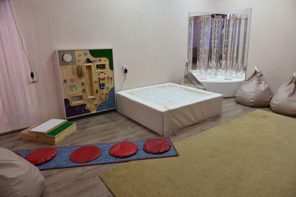 В новой сенсорной комнате, где разместились сухой бассейн, воздушно-пузырьковые ванны, тактильные панели, песок для рисования и др., будут проходить групповые и индивидуальные занятия с детьми разных возрастов.
