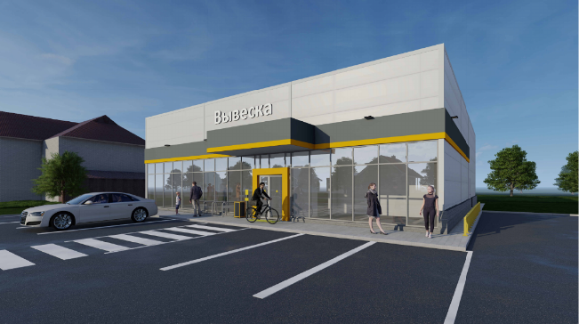 На первом этаже здания разместят инвентарь, переносное торговое оборудование и пункт охраны. На втором этаже запланированы административные помещения — приёмной, бухгалтерии и менеджеров по оптовым продажам.