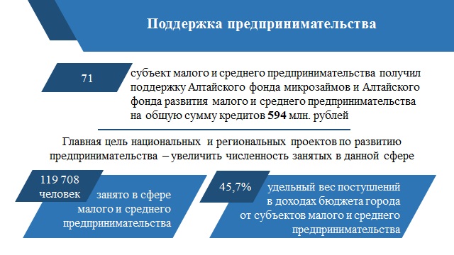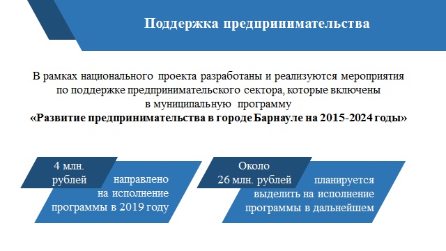 В рамках национального проекта рабочей группой в администрации города разработаны и реализуются мероприятия по поддержке предпринимательского сектора, которые включены в муниципальную программу «Развитие предпринимательства в городе Барнауле на 2015-2024 годы». На её исполнение в оставшиеся 5 лет из городского бюджета планируется направить ещё около 26 миллионов рублей. В 2019 году было направлено 4 миллиона рублей.