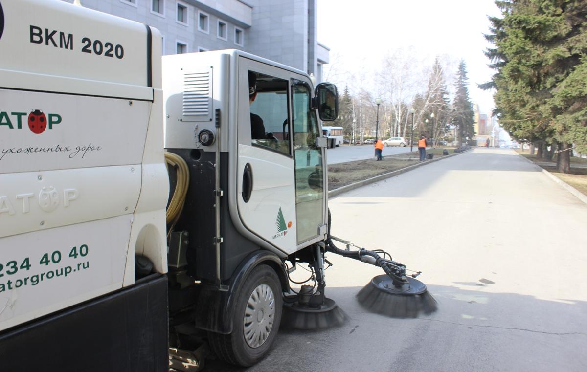 Коммунальная спецтехника очищает от пыли дороги и тротуары Барнаула