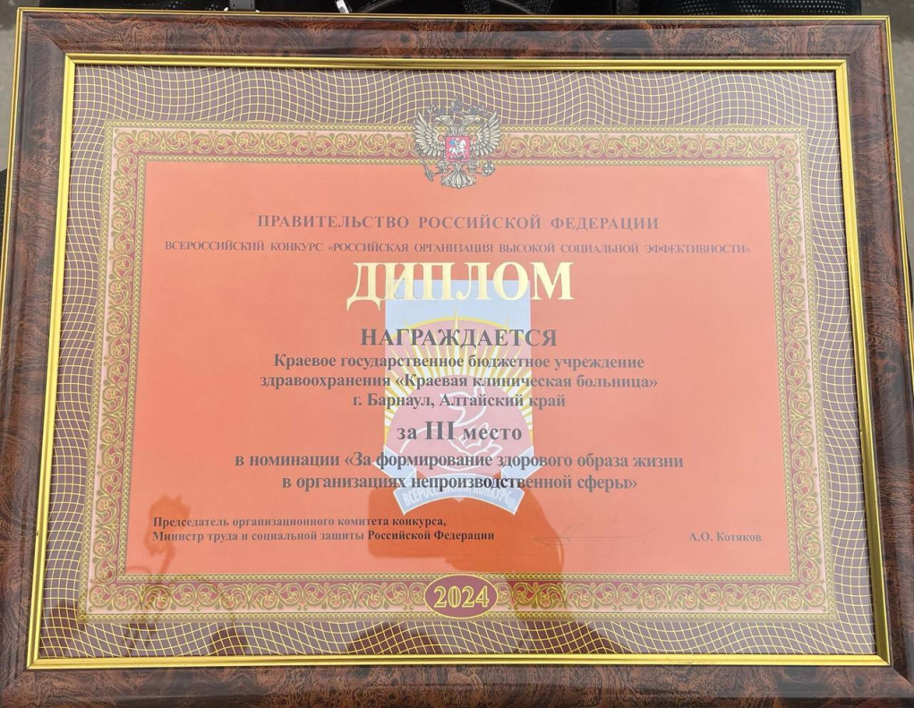 Краевая клиническая больница вошла в число победителей и призёров Всероссийского конкурса и заняла третье место в номинации «За формирование здорового образа жизни в организациях непроизводственной сферы».