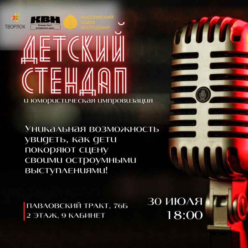 Четвертый детский стендап концерт пройдет в Барнауле 30 июля. Начало мероприятия в 18:00, площадка - зал по адресу Павловский тракт, 76Б, 2 этаж, кабинет 9.