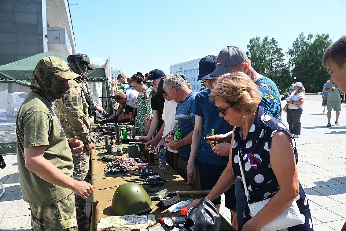Молодежная площадка праздника «Россию строить молодым» была разбита не несколько тематических зон. У театра драмы разместился Пункт отбора по контракту на военную службу. Здесь любой желающий, в том числе, жены или родители бойцов СВО, могли узнать о том, какие региональные и федеральные выплаты положены военнослужащему по закону.