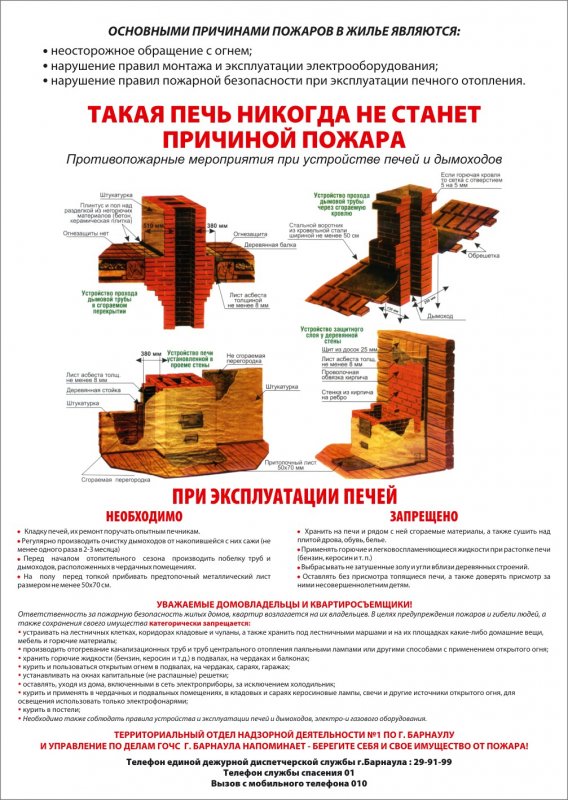 Территориальный отдел надзорной деятельности и профилактической работы № 1 УНД и ПР Главного управления МЧС России по Алтайскому краю рекомендует регулярно производить очистку дымоходов и печей от накопившейся в них сажи (не менее одного раз в два месяца). Ремонт печи поручать опытным специалистам.