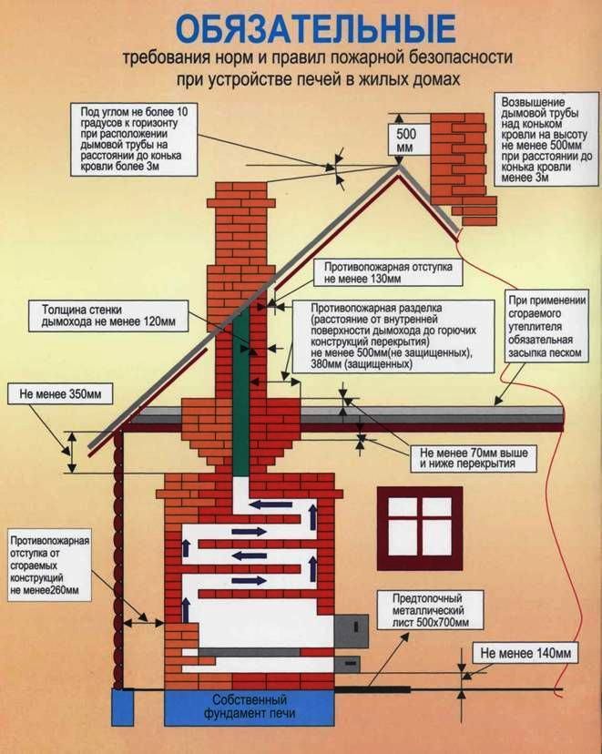 Важным условием предупреждения пожара от печного отопления является строгое выполнение правил пожарной безопасности при их эксплуатации. Строительные нормы и правила требуют, чтобы любая печь отвечала строгим противопожарным требованиям: дымовая труба печи при проходе через деревянные чердачные или междуэтажные перекрытия должна иметь утолщения кирпичной кладки (разделки) с таким расчетом, чтобы расстояние от внутренней поверхности трубы, смываемой топочными газами, до сгораемых элементов дома было не менее 51 см для печей с интенсивной топкой и 38 см для жилых домов, квартир.