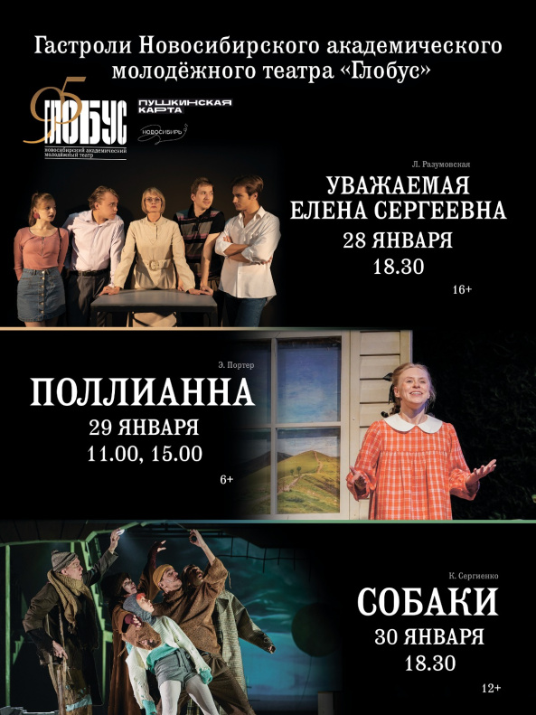 Закроет гастроли «Глобуса» в Барнауле показ спектакля «Собаки» по мотивам повести Константина Сергиенко. В овраге на окраине города живут вольные псы. У каждого своя история: встреча с человеческим безразличием, предательством и даже жестокостью. Но ничто не может разрушить веру собак в волшебную дверцу, за которой скрывается счастье. Ночами они утопают в нежных запахах неба, темноты и лунного света. А днём познают житейские радости, горести и мечтают встретить его – своего Человека. Правда, никто из собак даже не подозревает, чем обернётся эта встреча – удачей, покоем или трагедией. Показ состоится 30 января, начало в 18:30.