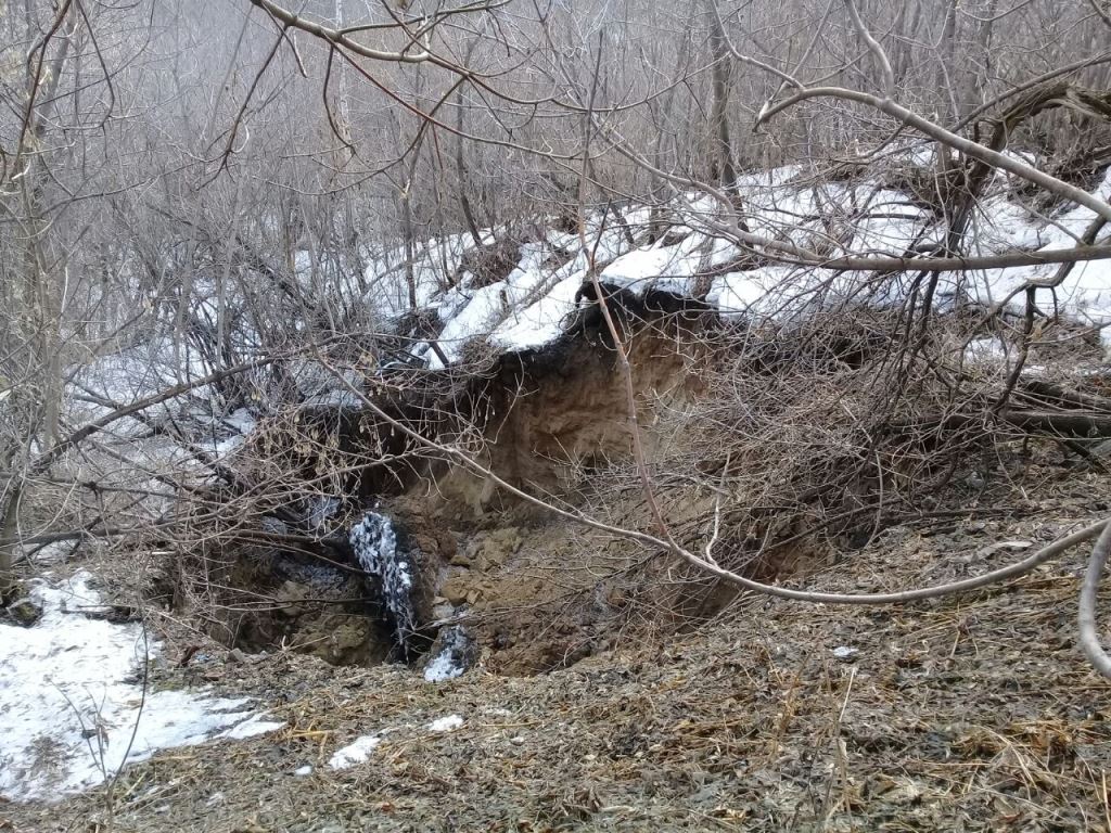 Администрацией района организована работа по регулярной расчистке канала, который отводит стоки от жилых домов. Завтра планируется начать возведение защитной земляной насыпи в верхней части склона со стороны улицы Маяковского, которая будет препятствовать стокам.
