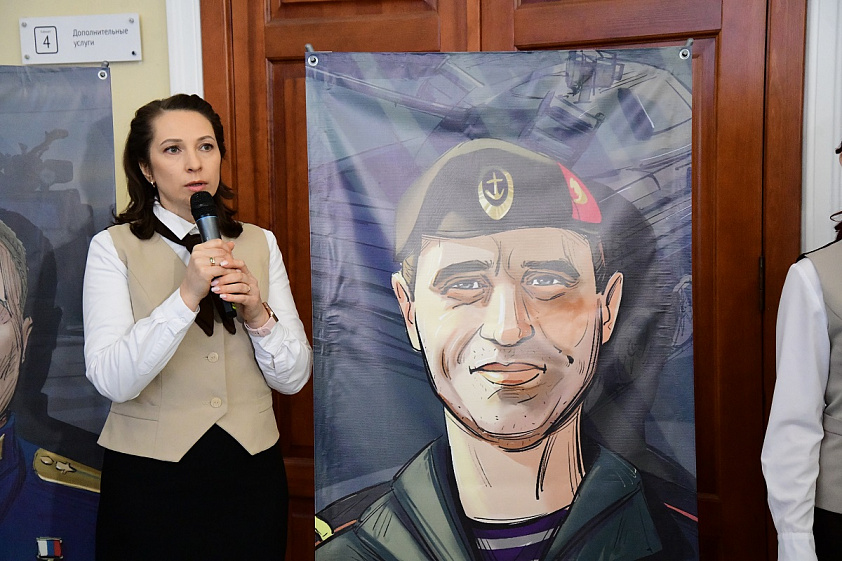 В МФЦ на проспекте Ленина с помощью шлемов виртуальной реальности можно пройтись по выставке, не двигаясь с места, рассмотреть каждый рисунок внимательно и на близком расстоянии. Познакомиться с экспозицией можно также через инфокиоск, используя QR-коды на портретах и печатные материалы — комиксы, кстати, выполнены в очень высоком качестве и по задумке, и по решению. Страницы комиксов рассказывают, как бойцы, рискуя своими жизнями, спасают товарищей, удерживают под авиаударами стратегически важные рубежи.
