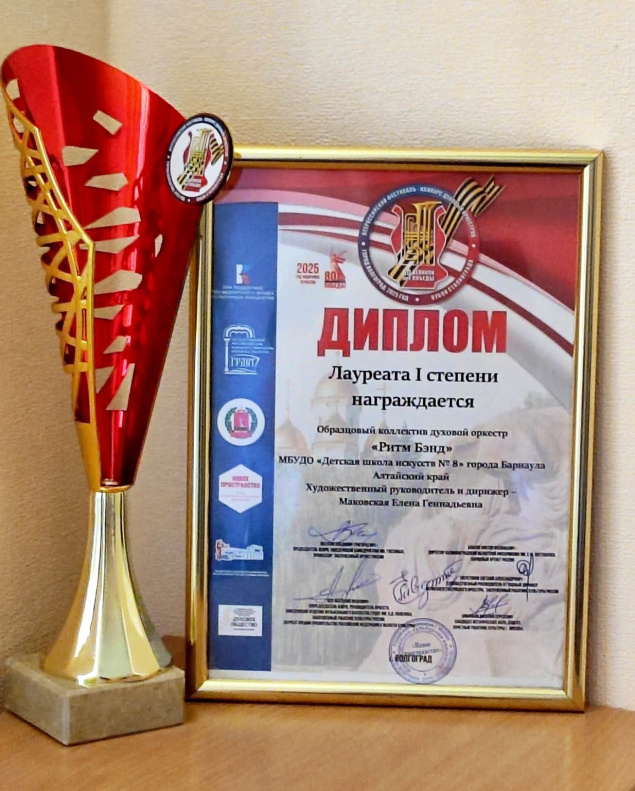 КультураОбразцовый духовой оркестр «Ритм Бэнд» Детской школы искусств №8 города Барнаула стал обладателем диплома лауреата 1 степени Всероссийского фестиваля-конкурса духовых оркестров «Кубок Сталинграда», который состоялся с 1 по 4 мая 2025 года в Волгограде, и был посвящен 80-летию Победы в Великой Отечественной войне 1941-1945 гг.