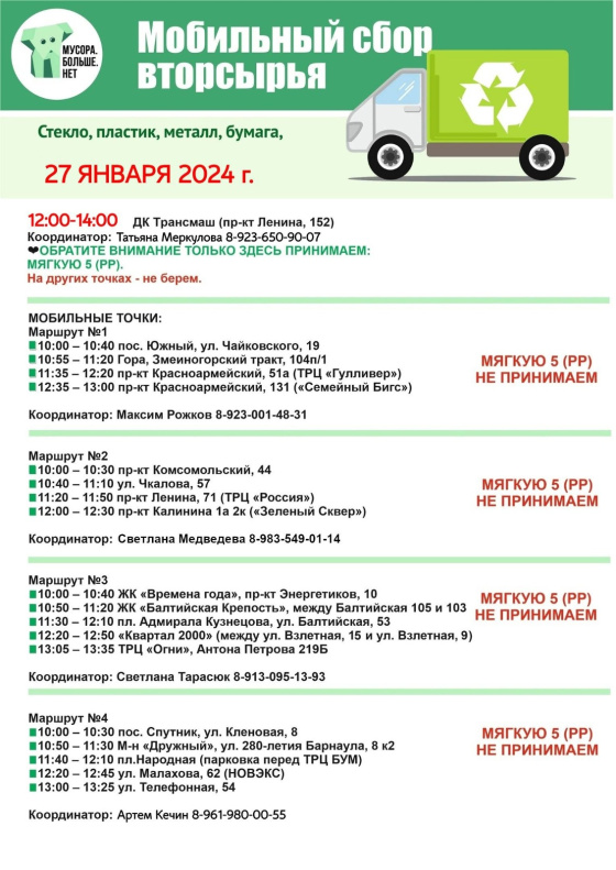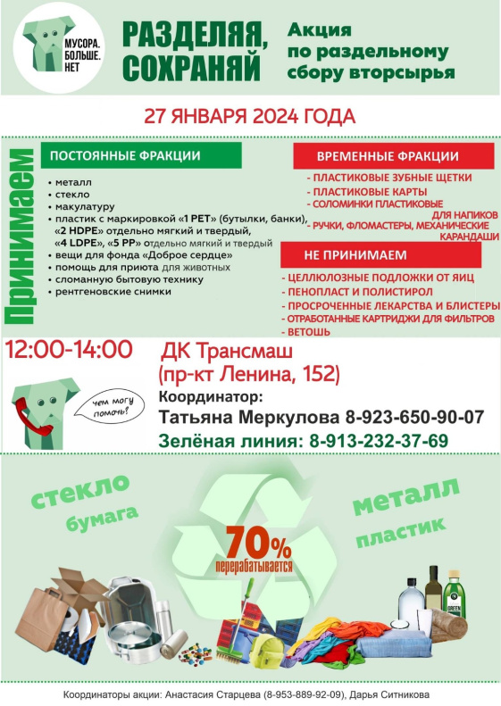 В субботу, 27 января, в Барнауле пройдет первая в этом году экологическая акция по раздельному сбору отходов «Разделяя сохраняй!». Организаторами мероприятия выступает общественная организация «Мусора.Больше.Нет» при поддержке комитета по благоустройству города Барнаула.