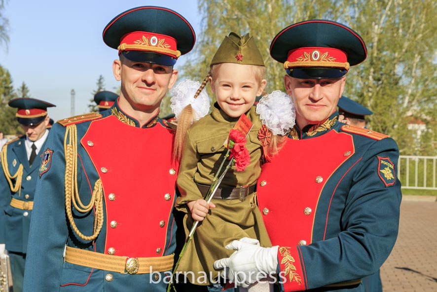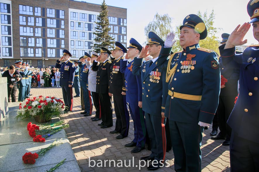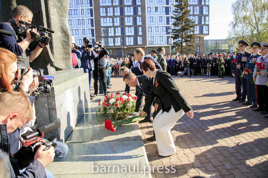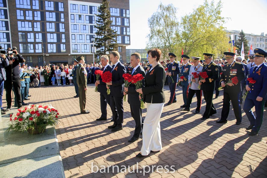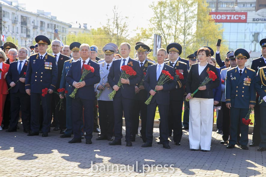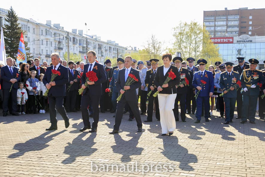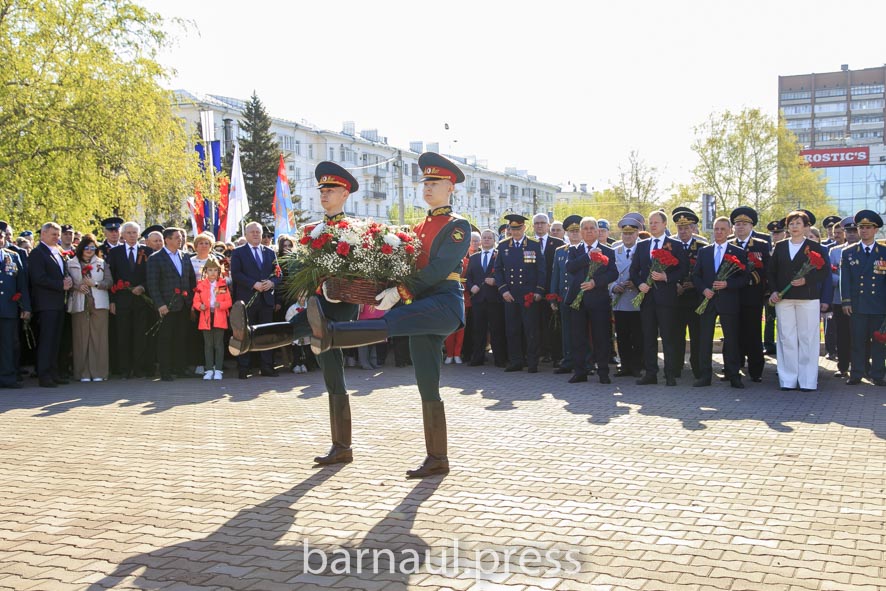 В День Победы в Барнауле праздничные мероприятия по традиции начинаются с церемонии возложения цветов к скульптурной группе «Прощание», монументу с фамилиями Героев Советского Союза и полных кавалеров ордена Славы, Вечному огню.