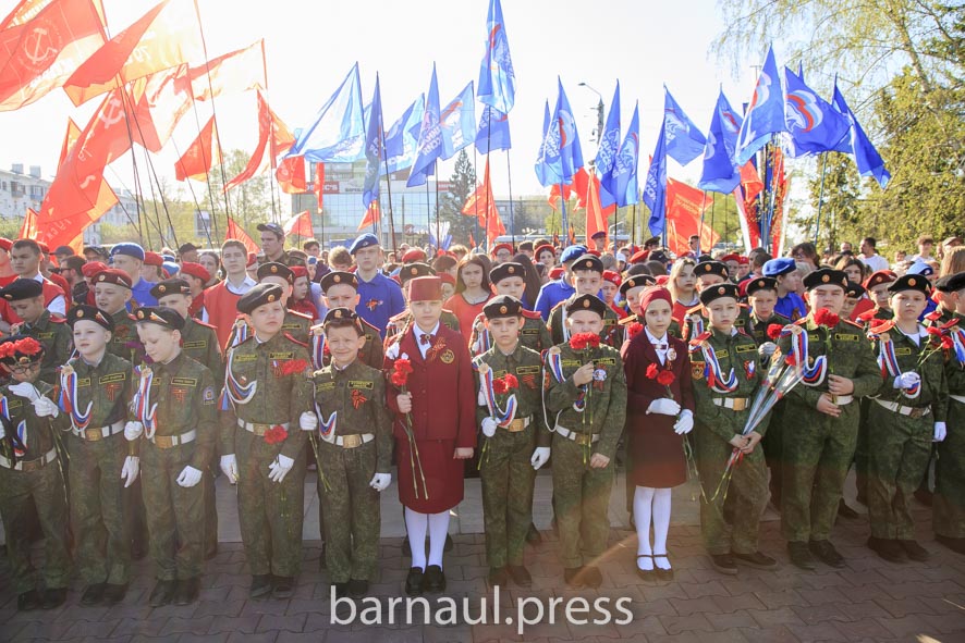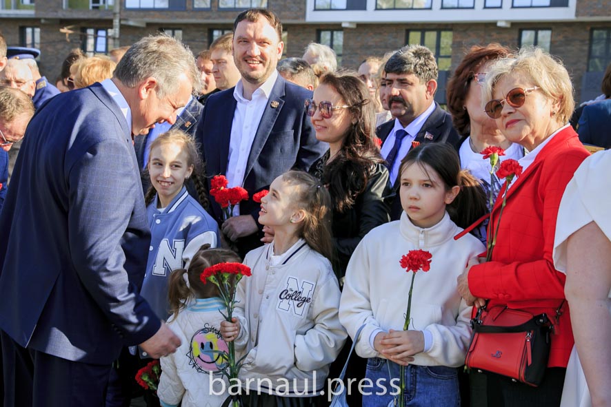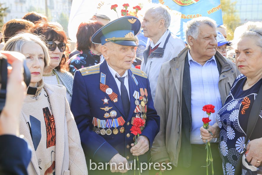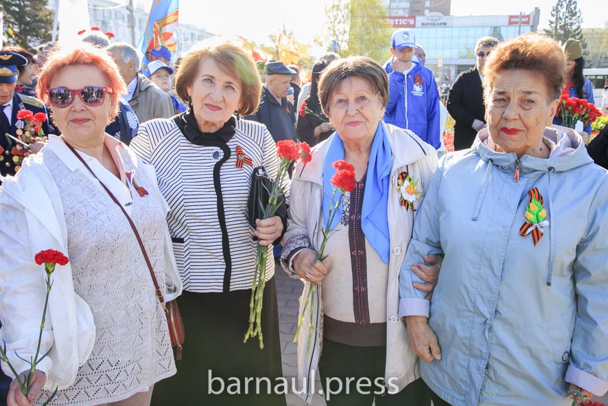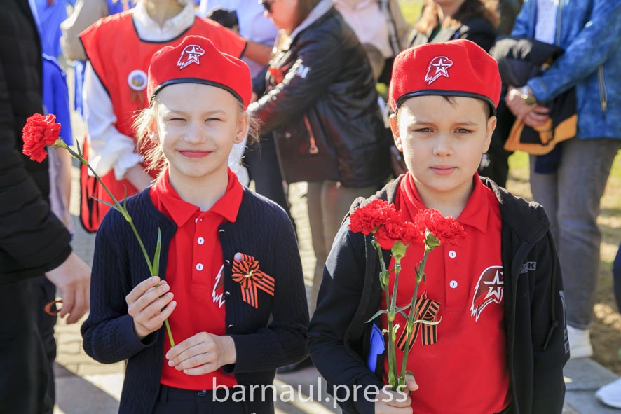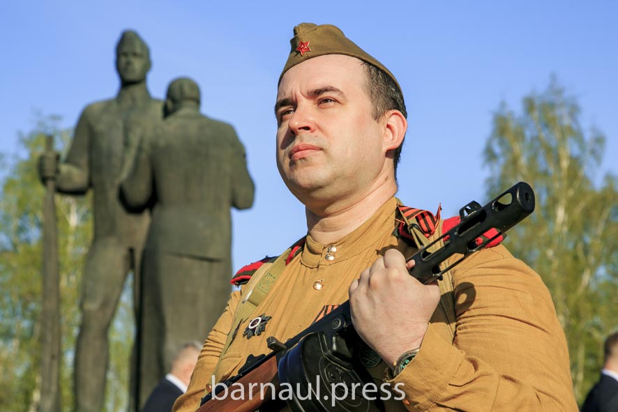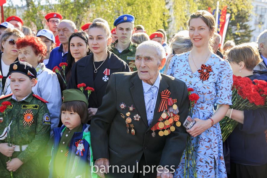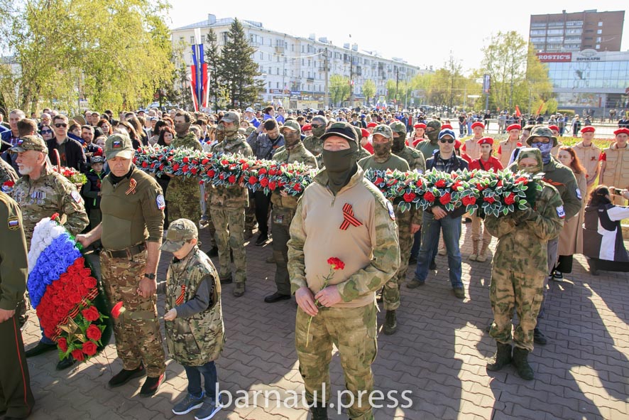 В День Победы в Барнауле праздничные мероприятия по традиции начинаются с церемонии возложения цветов к скульптурной группе «Прощание», монументу с фамилиями Героев Советского Союза и полных кавалеров ордена Славы, Вечному огню.