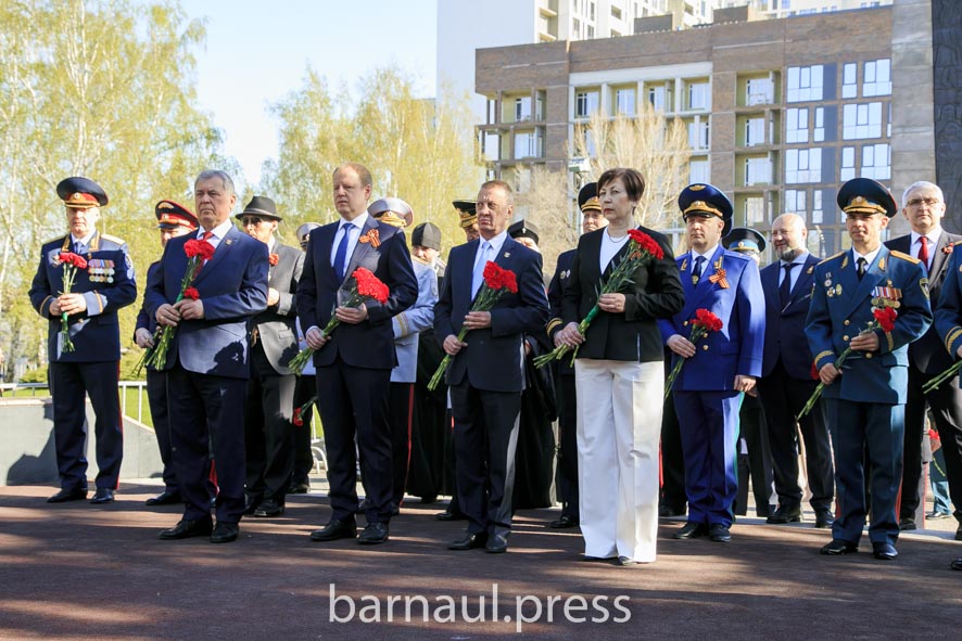 Почтить память героев на Мемориал Славы пришли Губернатор Алтайского края Виктор Томенко, председатель Алтайского краевого Законодательного Собрания Александр Романенко, глава Барнаула Вячеслав Франк, председатель Барнаульской городской Думы Галина Буевич, сенатор Российской Федерации от Алтайского края Наталья Кувшинова, главный федеральный инспектор по Алтайскому краю Юрий Земский, ветераны, представители Правительства Алтайского края, администрации города, депутаты АКЗС, БГД, представители федеральных ведомств, силовых структур, религиозных, молодежных и общественных организаций, неравнодушные барнаульцы.