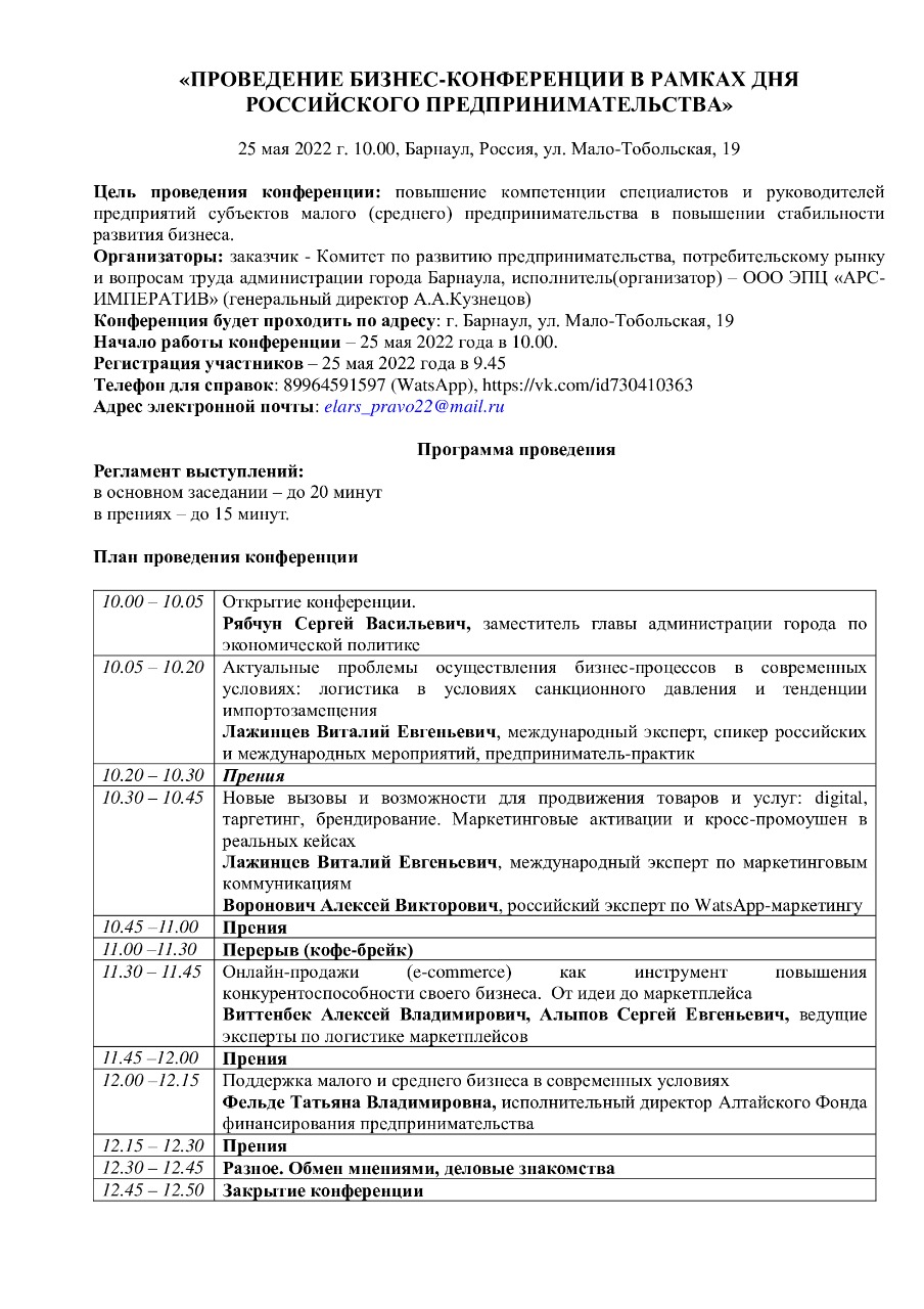 25 мая в Центре «Мой бизнес», состоится бизнес-конференция, в рамках Дня российского предпринимательства. Участие примут ведущие эксперты, спикеры по направлениям предпринимательской деятельности.