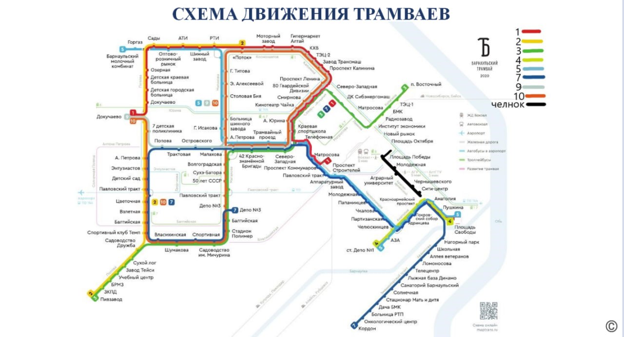 Трамвай №7: Депо №3 – ул. Власихинская – ул. Попова – ул. А.Петрова – ул.Челюскинцев – ул.Анатолия – пр.Красноармейский – Змеиногорский тракт – ст. «Кордон».