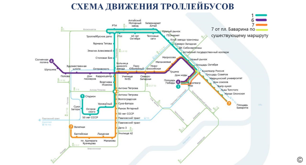 Троллейбус №7: конечная остановка «Улица Взлетная» – ул.Попова – ул.Балтийская – ул.Малахова –– ул.Матросова – пр.Ленина – пр.Строителей – пл.Победы – пр.Строителей – пр.Ленина – пл. Баварина. В обратном направлении от площади Баварина по проспекту Ленина – ул. Матросова – ул. Юрина – ул. Малахова – ул.Балтийская – ул.Попова – конечная остановка «Улица Взлетная».