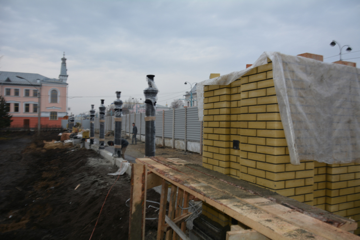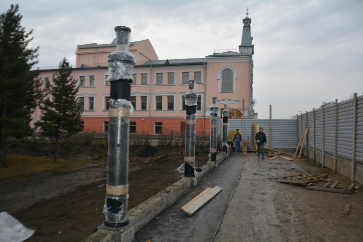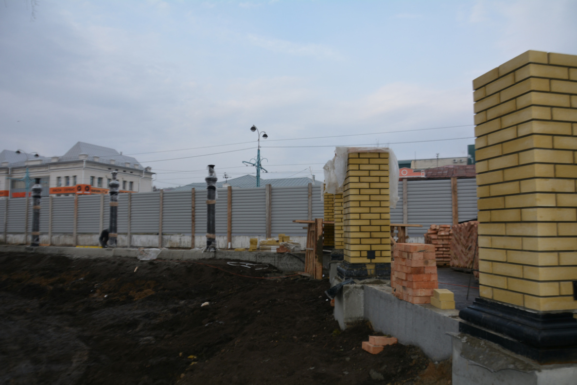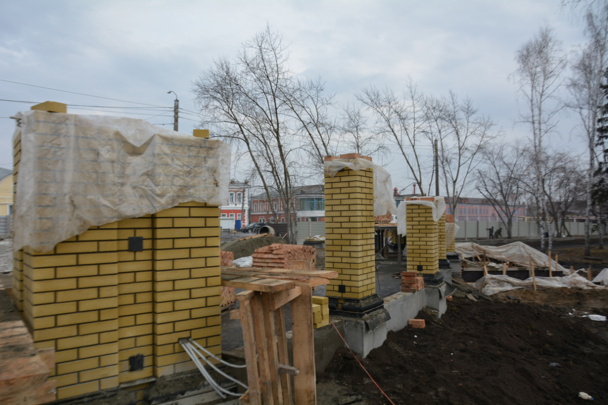 Ведется кладка кирпичных столбов. Вчера начался монтаж чугунных столбов. Конструкции ограждения, которые будут между ними, уже изготовлены на Каменском металлозаводе и в ближайшее время поступят в краевой центр.