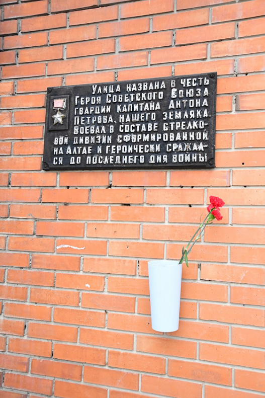 На фасаде дома на улице Антона Петрова, 120, расположена табличка с информацией о Герое Советского Союза гвардии капитане Антоне Петрове, который воевал в составе стрелковой дивизии, сформированной на Алтае. Бывший инструктор физкультуры принимал участие в освобождении Восточной Пруссии, Белоруссии и в Ельнинской наступательной операции. В 1965 году улицу Газонную в Барнауле переименовали в улицу Антона Петрова, что примечательно, еще при жизни героя. Антон Васильевич дожил до 78 лет, а через два года после его ухода, в 1990 году, был установлен памятный знак на улице, названной в его честь.