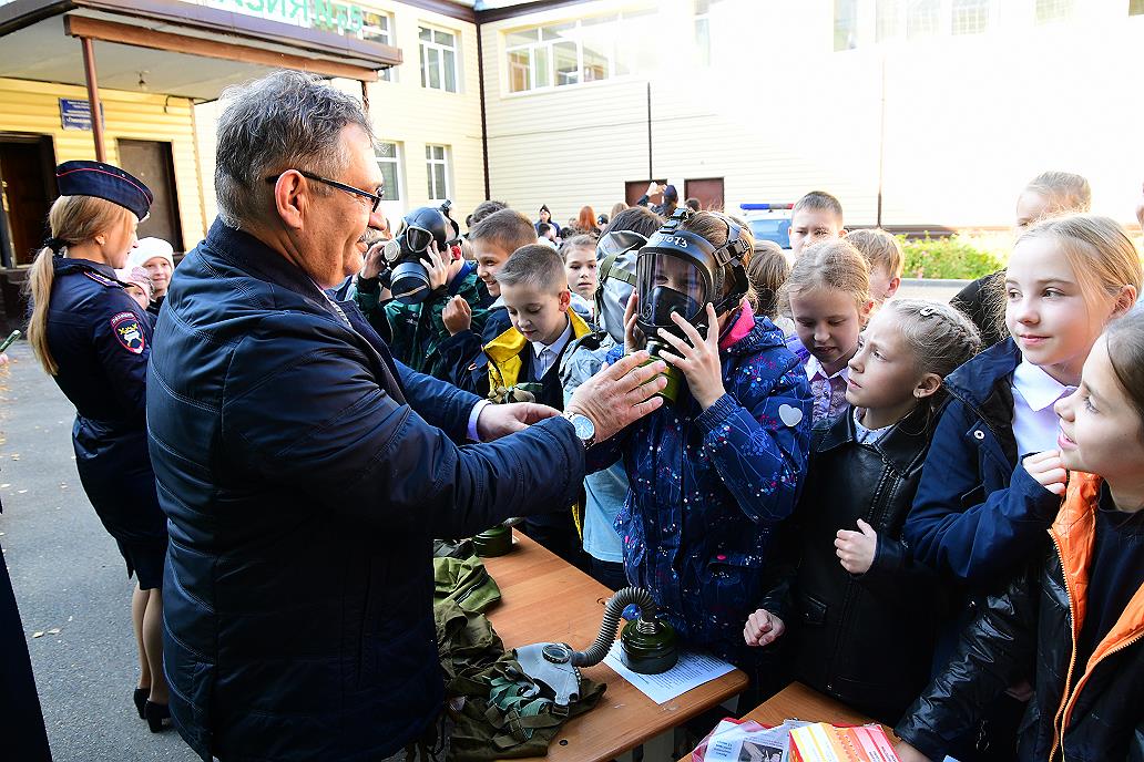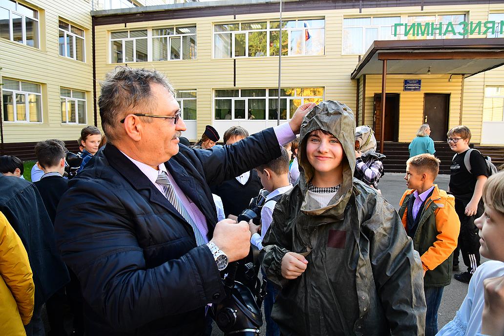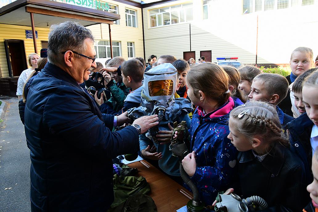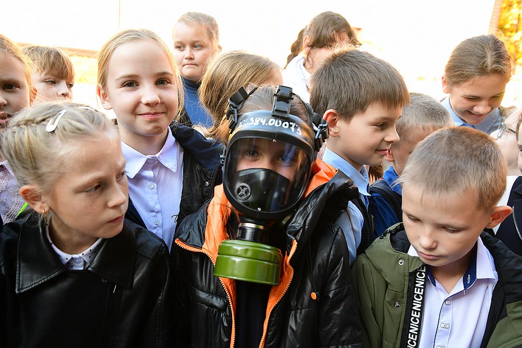 Фото: Андрей Чурилов– В ходе таких мероприятий мы учим детей защищать не только себя, но и своих родных, близких, – комментирует главный специалист, начальник штаба по делам ГОЧС администрации Центрального района Барнаула Тимур Пискунов. – Всего на площадке гимназии № 5 у нас организована работа по пяти направлениям. Мы на своем представляем блок гражданской обороны и показываем ребятам средства индивидуальной защиты органов дыхания и кожи, в частности, костюм защиты Л-1.