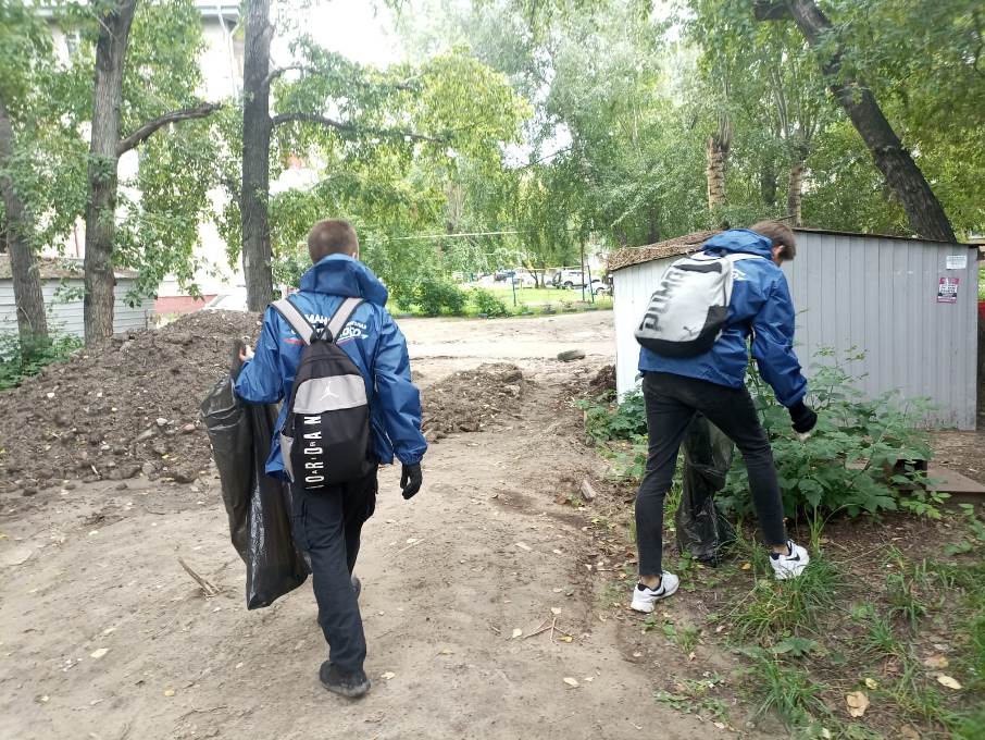 Бойцы экологического отряда помогают убирать мусор в Ленинском районе Барнаула