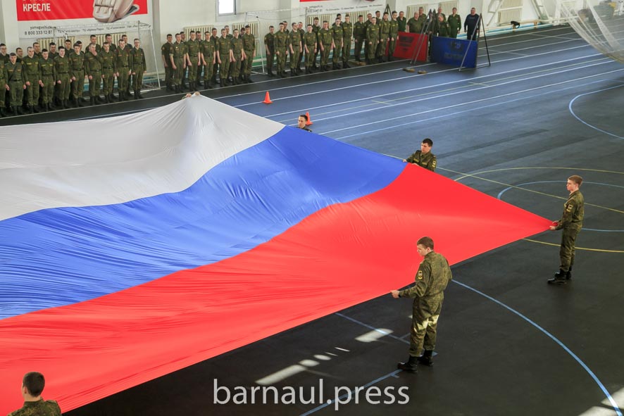 В рамках мероприятия студенты военного учебного центра АлтГТУ приняли участие в акции «Флаг единства». Под государственный гимн в манеже университета был развёрнут 14-метровый флаг Российской Федерации.