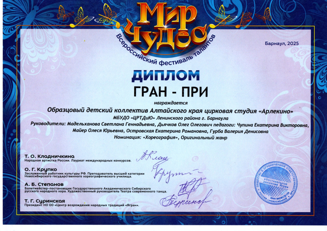 КультураКоллектив обучающихся Образцового детского коллектива Алтайского края цирковой студии «Арлекино» Центра развития творчества детей и юношества Ленинского района стал обладателем Гран-при всероссийского фестиваля талантов «Мир чудес» в номинации «Оригинальный жанр».