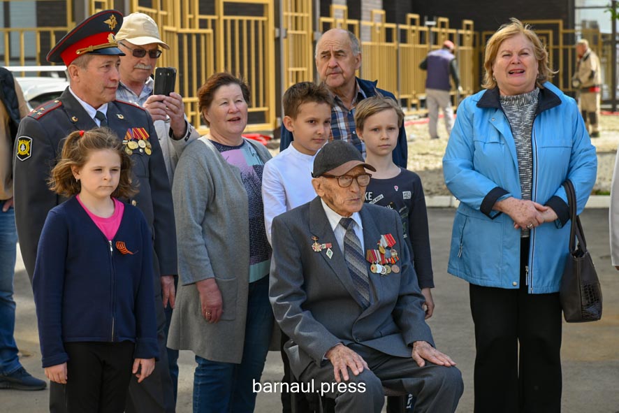 Для ветеранов была организована акция «Парад у дома ветерана», подготовленная комитетом по культуре города Барнаула. Для участников войны курсантка Барнаульского юридического института МВД России Дарья Маришина исполнила песни военных лет, а также выступил взвод почетного караула курсантов Барнаульского юридического института МВД России.