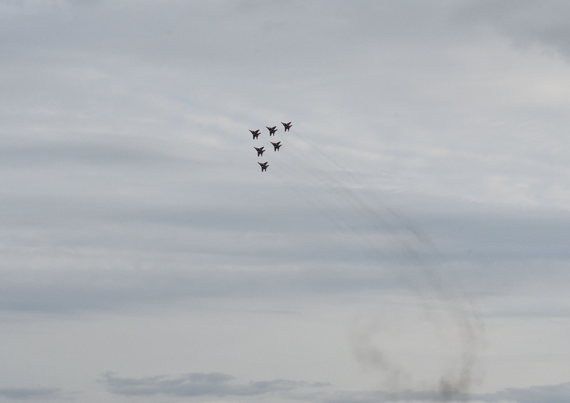 Летчики выполнили весь комплекс фигур высшего пилотажа с различными перестроениями с участием шести самолетов, а также продемонстрировали парный и полноценный одиночный пилотаж.
