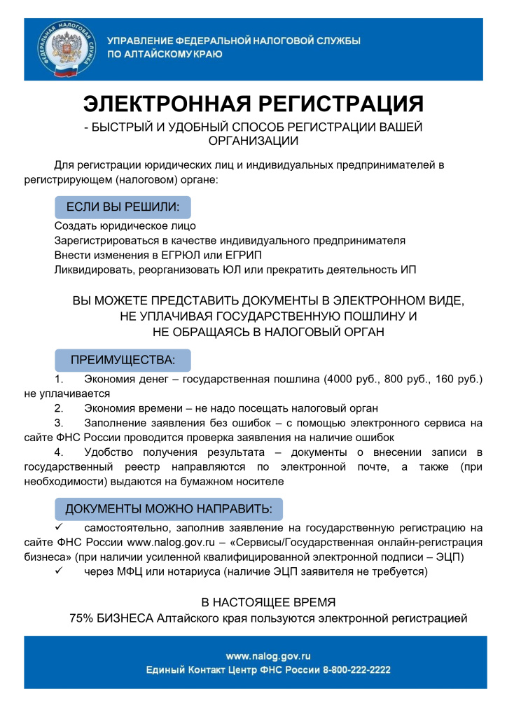 Как отмечают в УФНС по Алтайскому краю, в настоящее время 75% бизнеса региона пользуются электронной регистрацией.