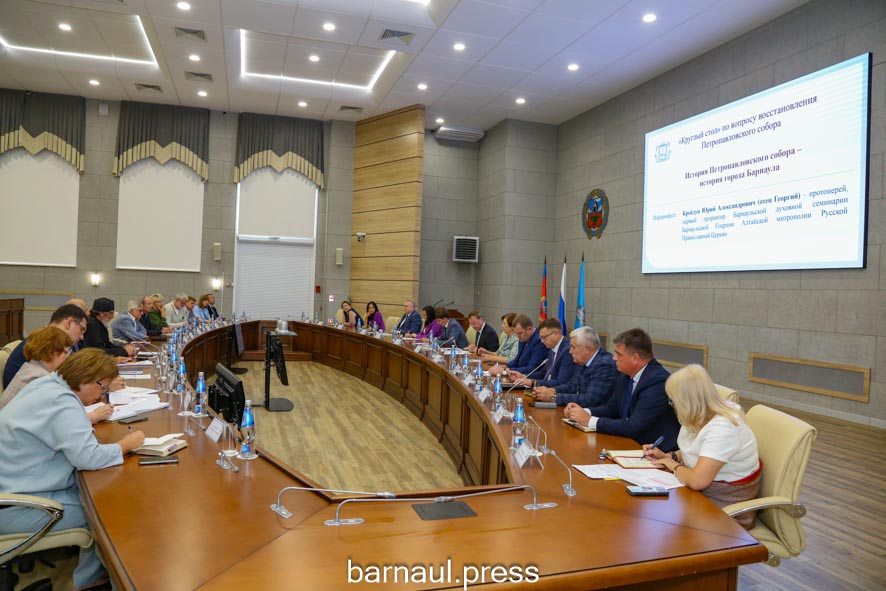 Об истории Петропавловского собора в Барнауле участникам «круглого стола» напомнил протоиерей Юрий Крейдун. По его словам, в сороковые годы 18 века начали строить первый храм, он был деревянным. Позже был возведен новый каменный Петропавловский собор, который освятили в 1774 году; в середине 19 столетия было принято решение произвести его ремонт и благоукрашение. Над собором была перекрыта кровля, заменены купола, надстроена колокольня для размещения 10-тонного колокола-гиганта, отлитого в Барнауле из меди, пожертвованной императором Николаем 1. Вид собора стал таким, каким он сохранился на фотографиях конца 19 – начала 20 века.