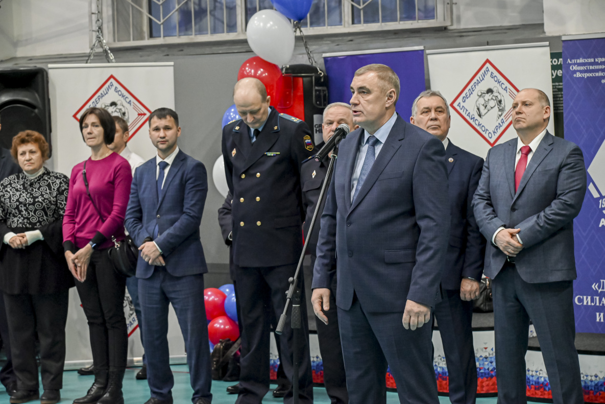 - Разрешите от имени Управления ФСБ России по Алтайского краю, краевого совета «Динамо» и всех динамовцев поприветствовать вас на ежегодном фестивале бокса, который в этом году стал юбилейным, - обратился к участникам и гостям Роман Плотников. - Символично, что это совпало с 80-летием Победы в Великой Отечественной войне, Годом защитника Отечества, столетием алтайской краевой организации «Динамо». Традиционно мы проводим турнир в декабре в преддверии профессионального праздника. Соревнования посвящены памяти сотрудников органов безопасности, погибших при исполнении служебного долга, в том числе в зоне специальной военной операции. К сожалению, в этом году в зале портреты восьми наших товарищей, сотрудников, отдавших самое ценное, жизнь, ради безопасности нашей страны, будущего наших детей. Хочу пожелать всем участникам, болельщикам здоровья, благополучия, мирного неба, спортсменам соответствующих соперников, болельщикам – ярких впечатлений.