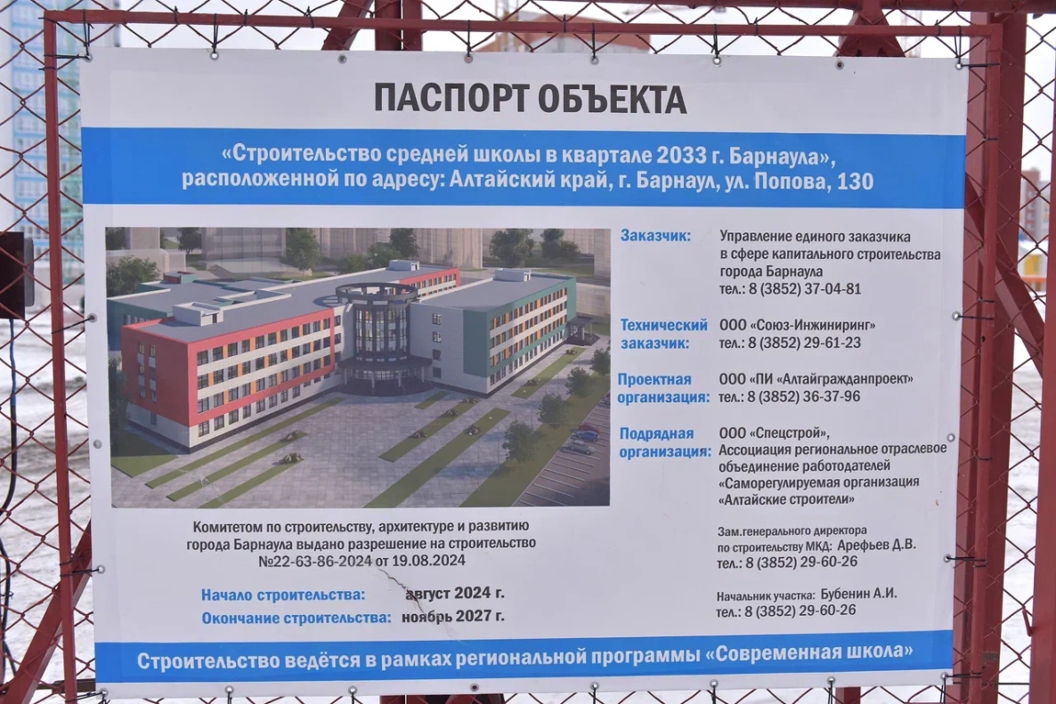 Строящаяся школа на 1100 мест, станет самой большой в Барнауле. Здание школы будет четырехэтажным. Общая площадь - более 18 тысяч квадратных метров. Для каждой ступени образования будет предусмотрена собственная пространственная зона. Их объединит центральный коридор и общая рекреация. Отдельный вход сделают для блока начальной школы. Доступ для подростковой и старшей школы организуют через вестибюльную группу центрального входа. Кроме учебных классов, гардеробов и других помещений, по проекту в здании будет пищеблок на 550 посадочных мест, актовый зал на 463 посадочных места. Физкультурно-оздоровительный блок будет включать в себя два спортивных зала с раздельными раздевалками, душевыми и санитарными узлами. Также в этом блоке расположат бассейн 7 на 24 метра глубиной от 0,9 до 1,8 метра, зал для хореографии и занятий лечебной физкультурой и тренажерный зал.
