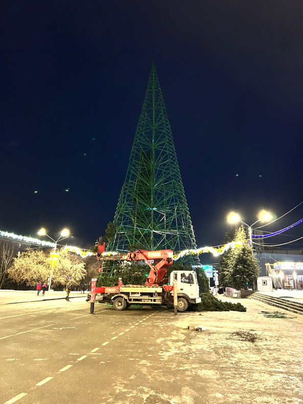 В настоящее время специалисты подрядной организации уже завершили установку конструкции 32-метровой новогодней ели и сейчас ведут работы по наполнению конструкции еловыми ветвями.