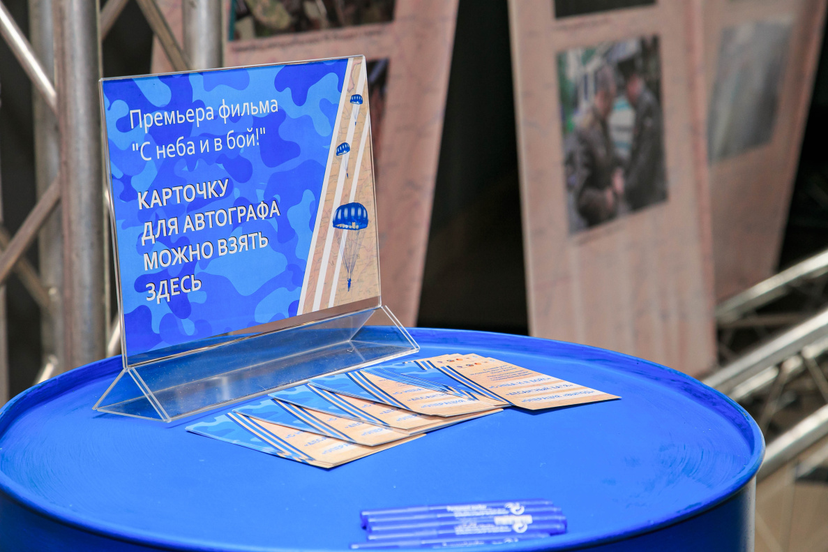 Премьерный показ фильма «С неба и в бой» состоялся при поддержке Фонда «Защитники Отечества» имени Владимира Шаманова. В нем приняли участие Губернатор края Виктор Томенко, Герой РФ, председатель комитета ГосДумы РФ по обороне Владимир Шаманов, делегация Героев Советского Союза и Российской Федерации, глава города Барнаула Вячеслав Франк, режиссер фильма Олег Штром, актер-исполнитель главной роли Михаил Жигалов и другие. Фильм создан  кинокомпанией «ФильмОКей» при поддержке Российской Ассоциации Героев