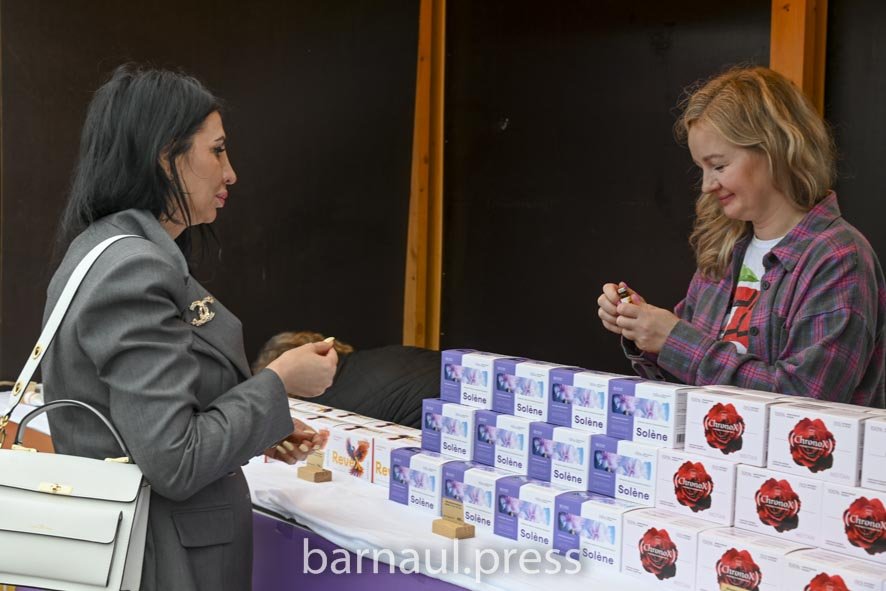 Также щедро представлены продовольственные товары: мёд, сыры, халва, напитки, растительные и сливочные масла и многое другое. Многие предусмотрительно организовали дегустации – барнаульцы с удовольствием пробовали фиточаи, мед, конфеты, сыры, колбасы и другие разносолы.