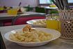В первый учебный день здесь к завтраку приготовили макароны с фрикадельками из курицы с соусом и напиток фруктовый, в обед детям подали еще и рассольник.